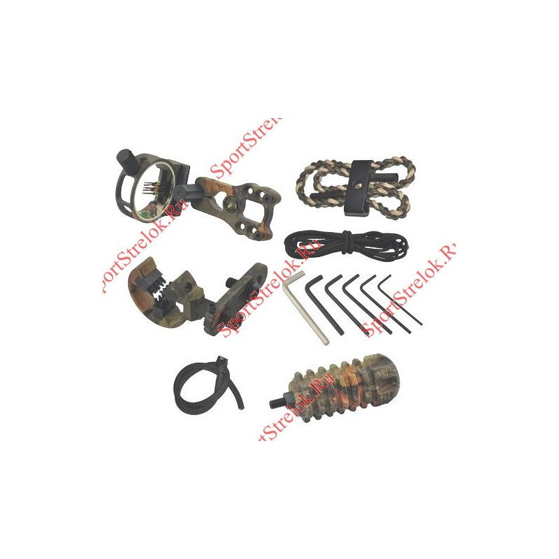 Комплектность: прицел 3 Пина с подсветкой, полочка 3 щётки, пип-сайт с резинкой, вязочка для кисти, стабилизатор, веревка для петли релиза, ключи для установки и регулировки аксессуаров.
